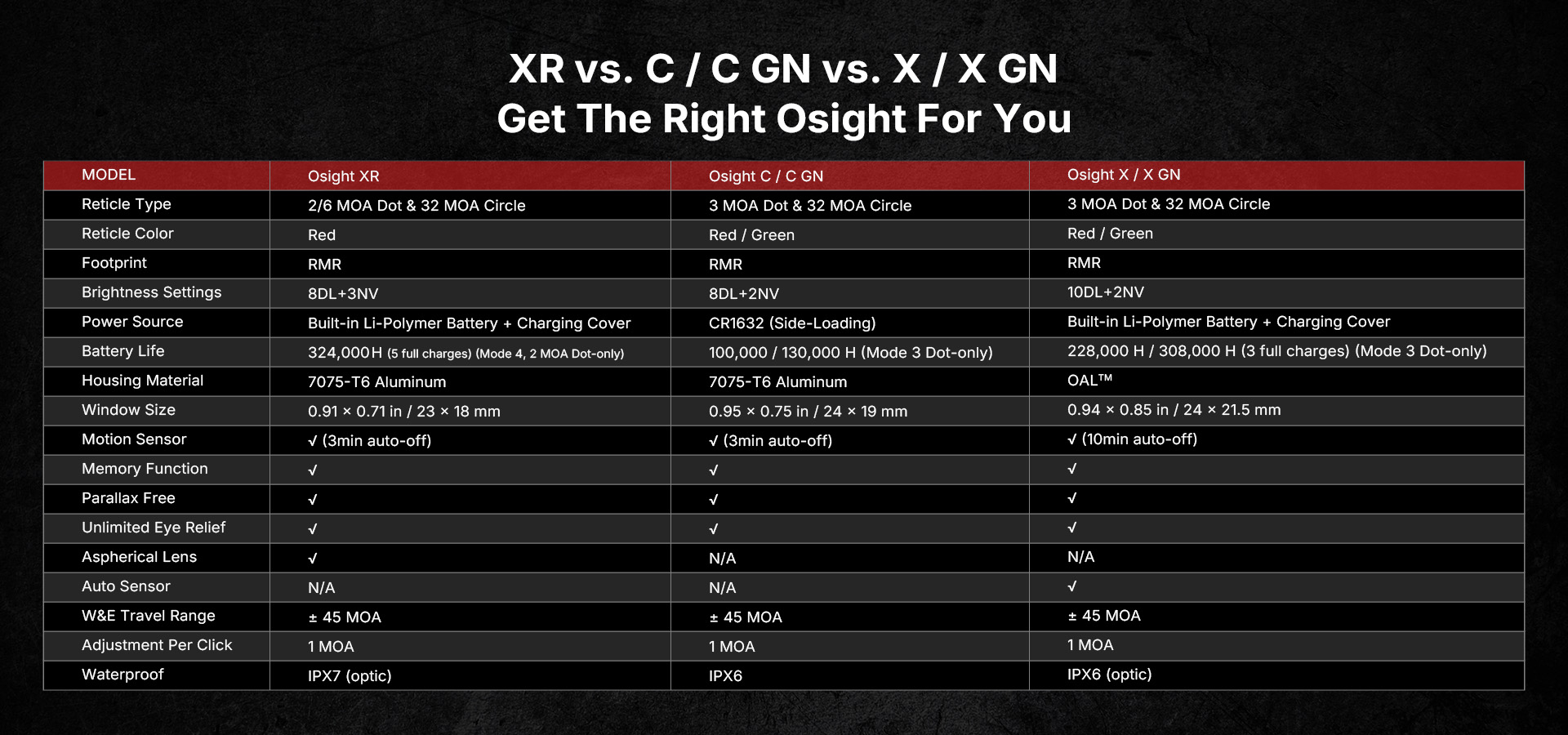 • Industryʼs First Patented Magnetic Charging Cover: The Osight XR brings a Patented Magnetic Charging Cover, the first and only of its kind in the industry, now upgraded with a redesigned form factor and integrated logo. It charges the optic while displaying real-time battery levels for both the cover and the sight, delivering innovation you can see and power you can trust.