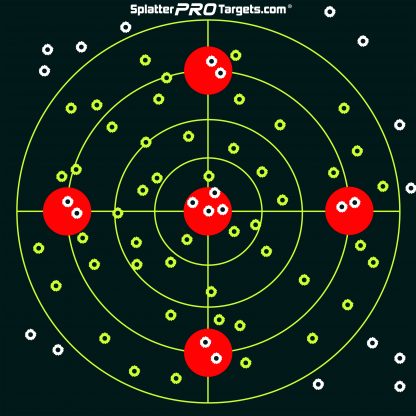Compare our Splatter Targets to anything on the market. Our targets lay flat and STAY FLAT. If you’ve ever had a target curl up on you when you’re at the range you know how frustrating that can be. Our targets are printed on sturdy 10 pt. board stock, not cheap paper. Our goal was simple. Make the best target on the market and we’ve done that. The Bright Fluorescent bullet holes are visible in all light conditions and help you quickly get on target and stay on target. Perfect for air guns, rim fire and center fire rifles and pistols. Our targets work great for sighting in shotguns as well.