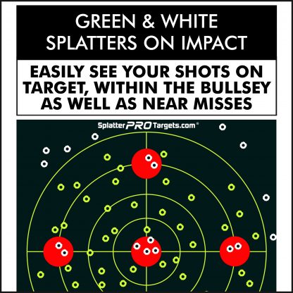 • Our HIGH VISIBILITY splatter targets make it EASY to see your shots at a distance, no more wasting time walking downrange to SEE YOUR SHOTS.