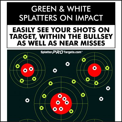 • Our HIGH VISIBILITY splatter targets make it EASY to see your shots at a distance, no more wasting time walking downrange to SEE YOUR SHOTS.
